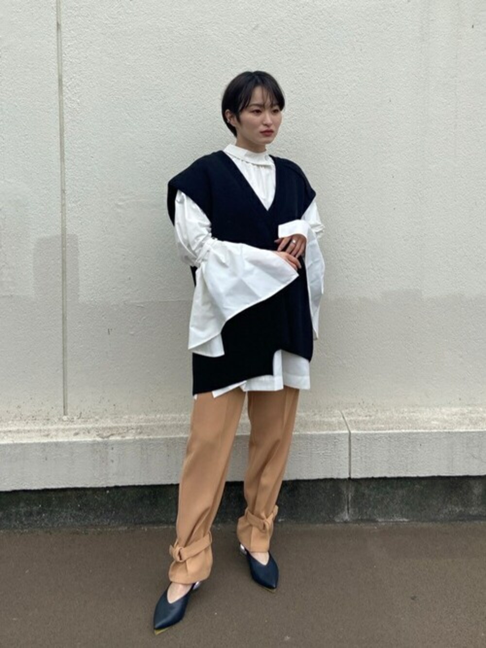 明るいカラーばっかりだと抵抗がある方はブラックのベストがオススメです!!!このパンツはブーツ合わせよりフラットシューズ(足の甲が見えるもの)で合わせるのが好きです♪