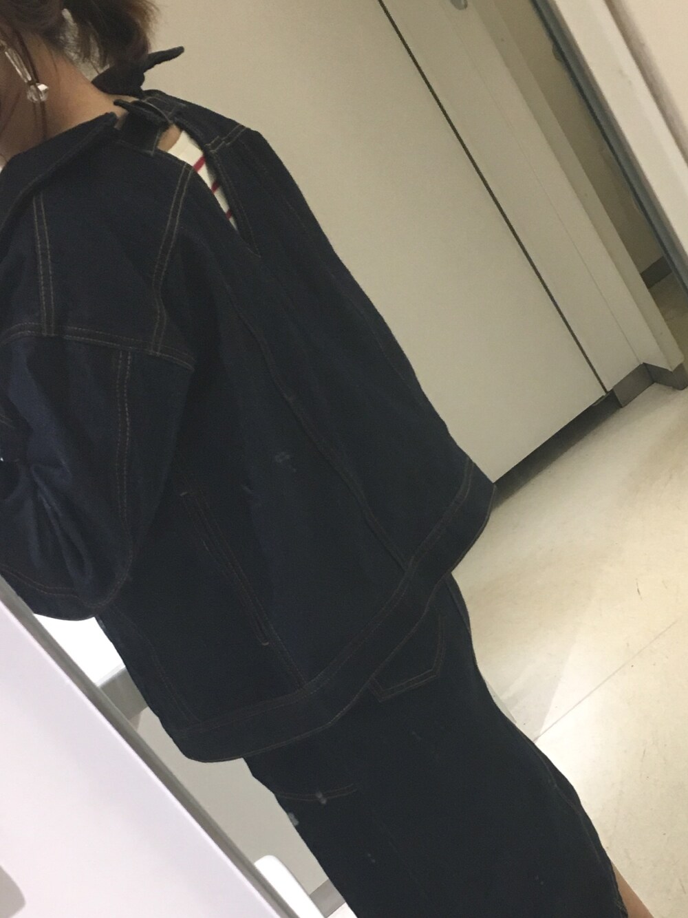 抜き襟のこなれ感に、春らしいマルチボーダーをデニムセットアップのコーディネートのアクセントに♡