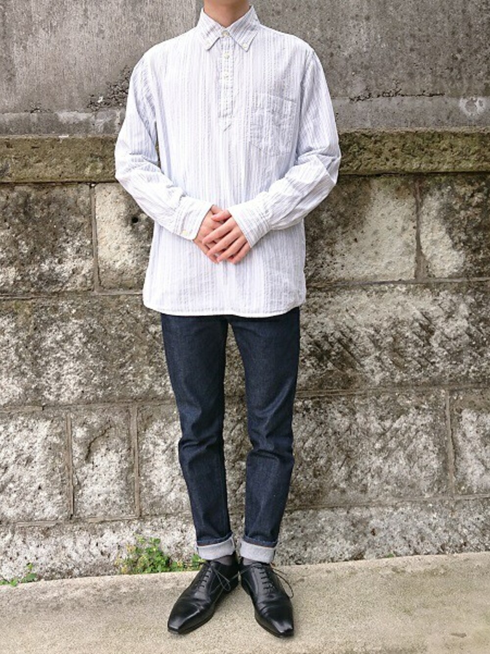 こんにちは。 春夏コーデです。春夏はカジュアルになる季節ですが、キレイめで過ごしたいです。 デニムとストライプ柄のプルオーバーシャツは相性が良いと感じます。 足元は革靴でキレイめ要素を足しました。 よろしくお願いします。