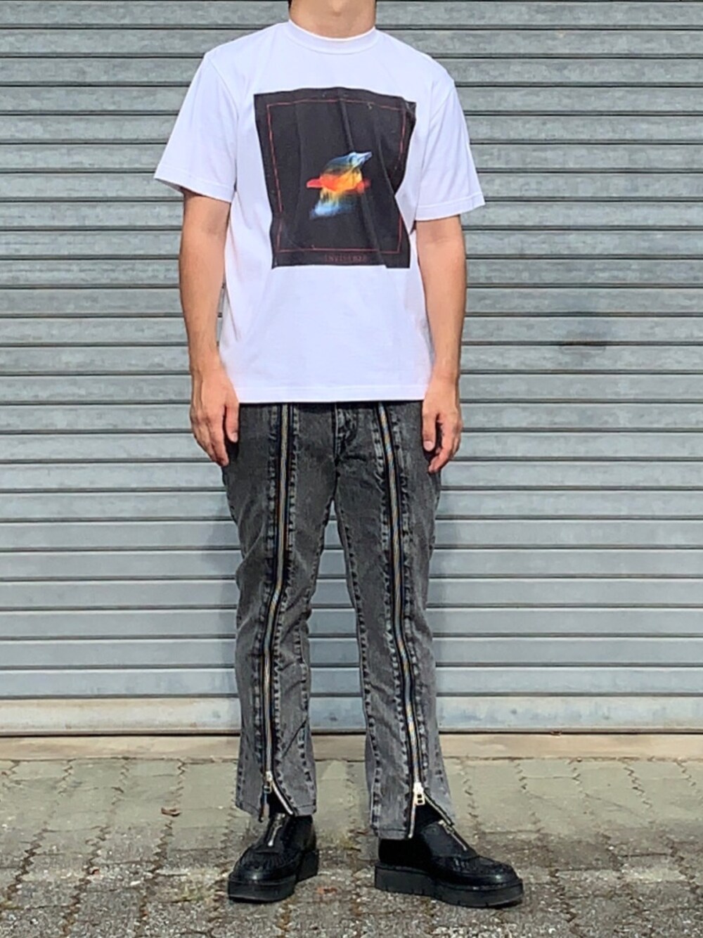 モノトーンコーデにtシャツの柄が映える