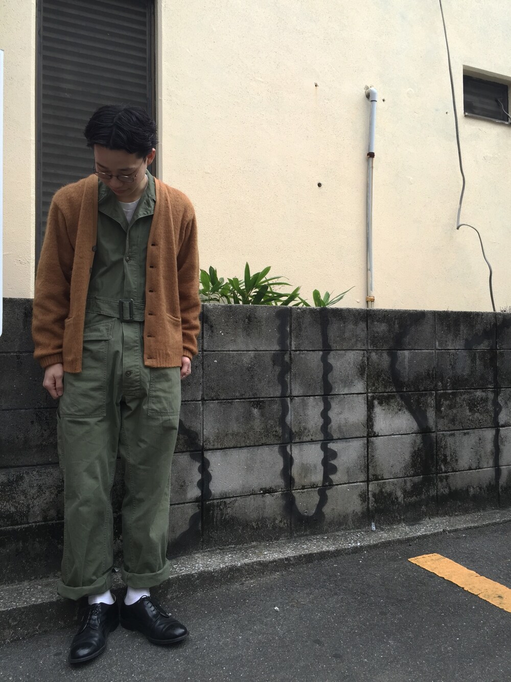 グリーン系のつなぎ/オールインワン、ブラウン系のカーディガン/ボレロを着用したメンズの秋コーディネートの1枚目の写真