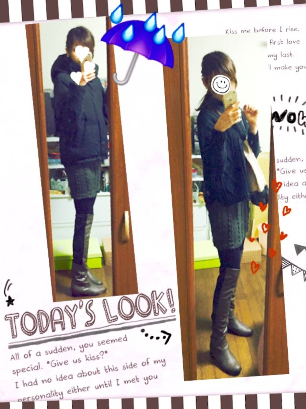 ゆる雨なので、フェイクレザーのニーハイブーツを長靴替わりに。 タイトニーハイ×タイトミニスカート。 お洒落な雨の日コーデを模索中です♪