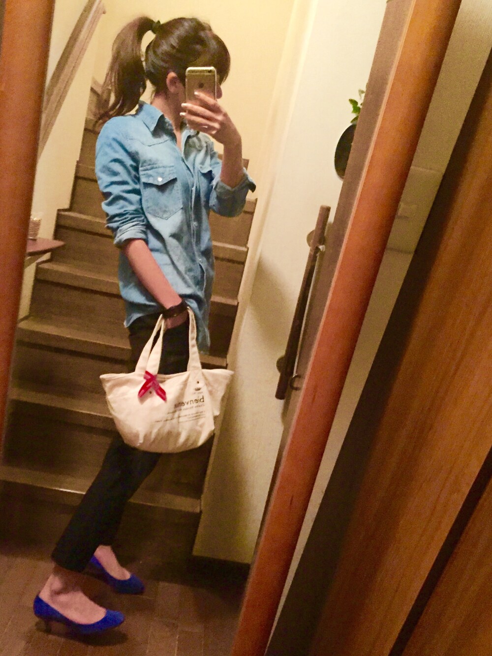 地元の飲み会ゆるゆるコーデ。 デニムシャツはオーバーサイズなので、お腹もお尻も隠れる!いっぱい食べれる!♪( ´▽`) ポニーテールでアクセント(年甲斐もなく💦)