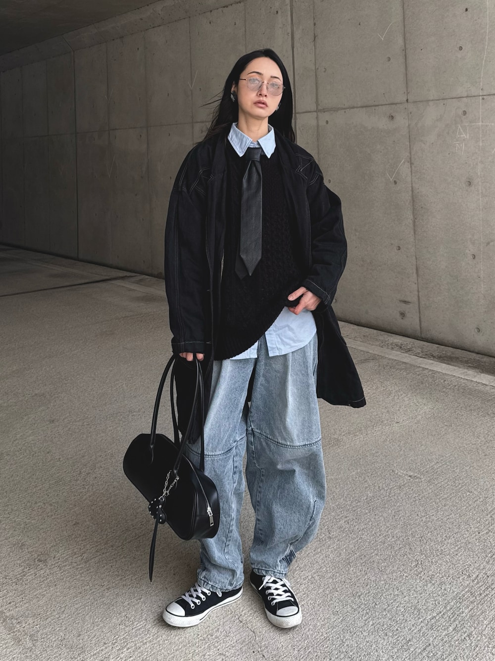オーバーサイズアイテムでメンズライクコーデ。色違いのデニムonデニム。 苦手なブルーシャツコーデ開拓中。 ゆったりサイズのケーブルニットと合わせてみました。 このネクタイ、ネックレス仕様で結ぶの苦手な人にもおすすめ♥ 古着のデニムジャケットはめっちゃ密で重たいけど風通さないから暖かい◎オーバーダイでめっちゃ味のあるいい色! ▫️ ケーブルパッチワークニット ▶︎FOUND GOOD 170cmLサイズで、腰周りしっかり隠れるゆったりサイズ!パッチワーク柄で、真っ黒でも地味に見えないのが◎ 【PR】FOUND GOOD ▫️ ハイウエストバナナデニムパンツ / High Waist Banana Denim Pants ▶︎PRANK PROJECT ▫️ ブラック×シルバーアクリルピアス ▶︎handmade〜SR〜 ▫️ TIE CHOKER / ネクタイチェーンチョーカー ▶︎musubore ▫️ AiiRZ ロゴ入りオーバーサイズカラーシャツ ネクタイ付き ID43612673 ▶︎SHEIN ▫️ プアッファーボストンバッグ ▶︎Naege ▫️ BLACK OVER DYED Denim Long Jacket ▶︎古着