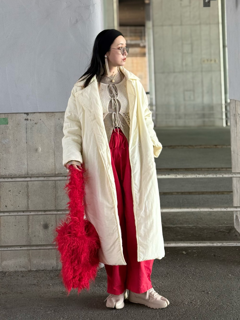 赤×アイボリー×ベージュの3色コーデ。 随分前のアウターだけど、カラーとナイロン素材が気に入っててずっと置いてる🤍 フォロワーさんが着てて可愛かったニット真似して買った♥ニットタンクとレイヤード。 ▫️ コイルメッシュコンビニットタンク PRANK PROJECT ▫️ MAISON MARGIELA:GX5141:PROJECT 0 CL CL LEATHER TABI Maison Margiela ▫️ 【ハンドウォッシャブル】ヘムスリットリブニット feepur ▫️ ミニファーモンスターバッグ / A4、14インチ以下PC収納可能 un/neu ▫️ 【金属アレルギー対応】Willow Fringe Pierce/フリンジピアス loni ▫️ 軽量コットンブレンドバルーンパンツ【ウエスト調整可能・ 夏用・フィット】(セットアップ対応) TAO