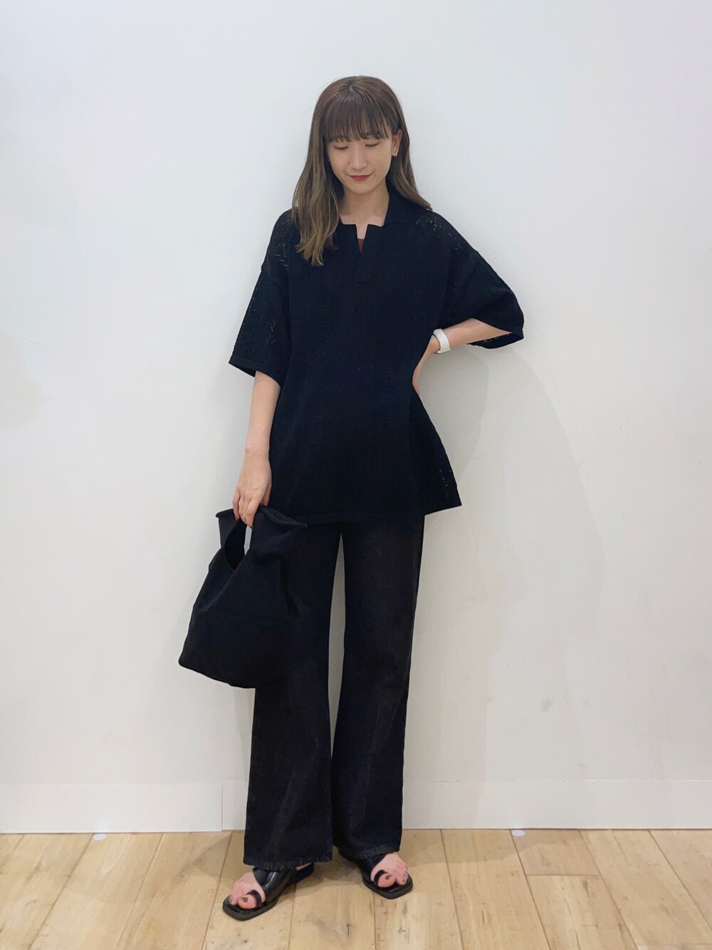 maiのニット/セーター「『ユニセックス』レースアミポロシャツ(5分袖)」を使ったコーディネート