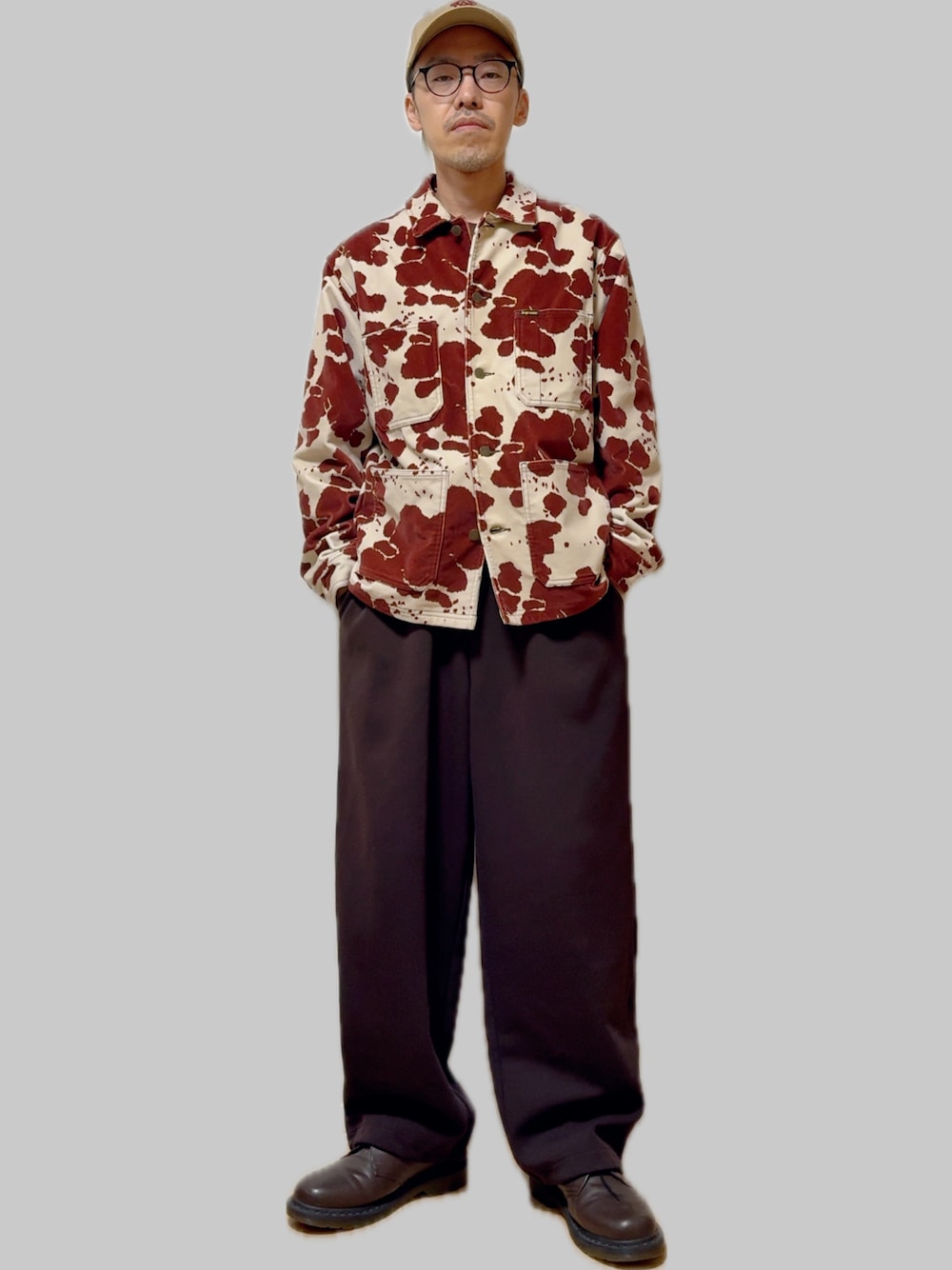 存在感のある Supreme の Velvet Chore Coatを軸に、ブラウン×ベージュの暖色でまとめたストリートスタイル。 素材の深みと柄のインパクトがありつつ、シルエットは落ち着いたワイドで大人っぽく仕上げました。 ボトムスは Uniqlo:C のスウェットパンツ。リラックス感がありながら、ブラウンカラーで全体と馴染む一本。 足元は Dr. Martens のレザーシューズでクラシックに。キャップは Ambergleam で抜け感をプラスしています。