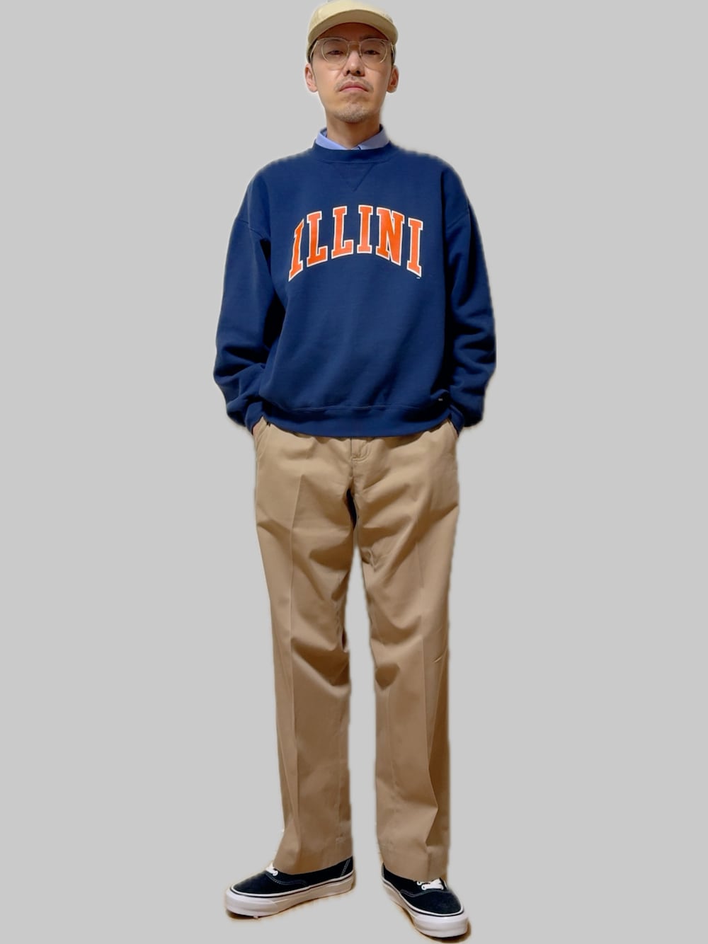 だいぶ暖かくなったので、久しぶりにアウターなしのコーデ。 90’s USA製ラッセルのカレッジロゴスウェットとLLBeanチノパン、Vansとアメカジ色だいぶ強かったので、メガネとスエードキャップでハズし。