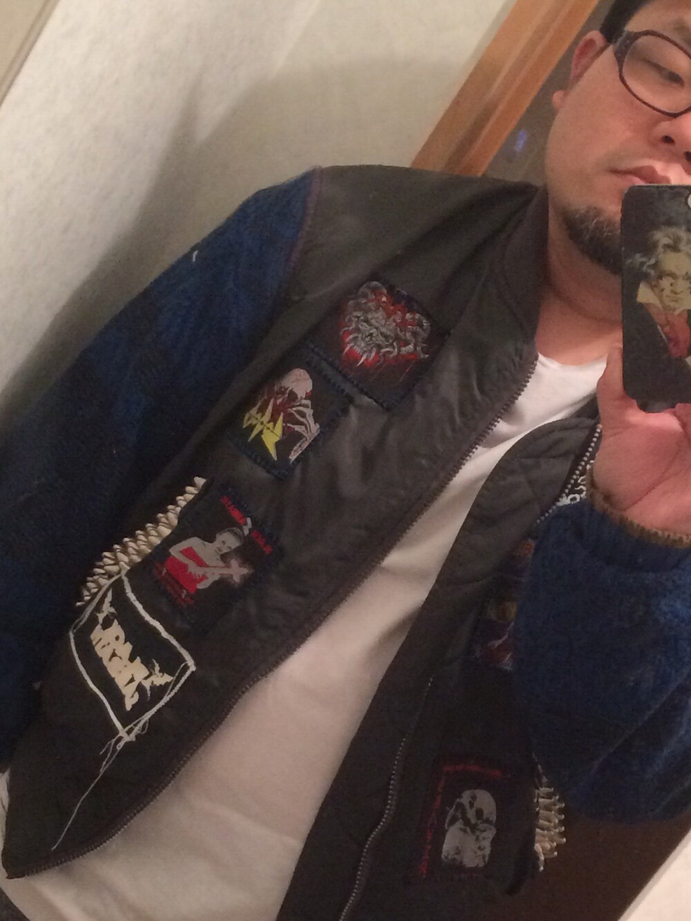 グリーン系のブルゾンを着用したメンズの秋コーディネートの1枚目の写真