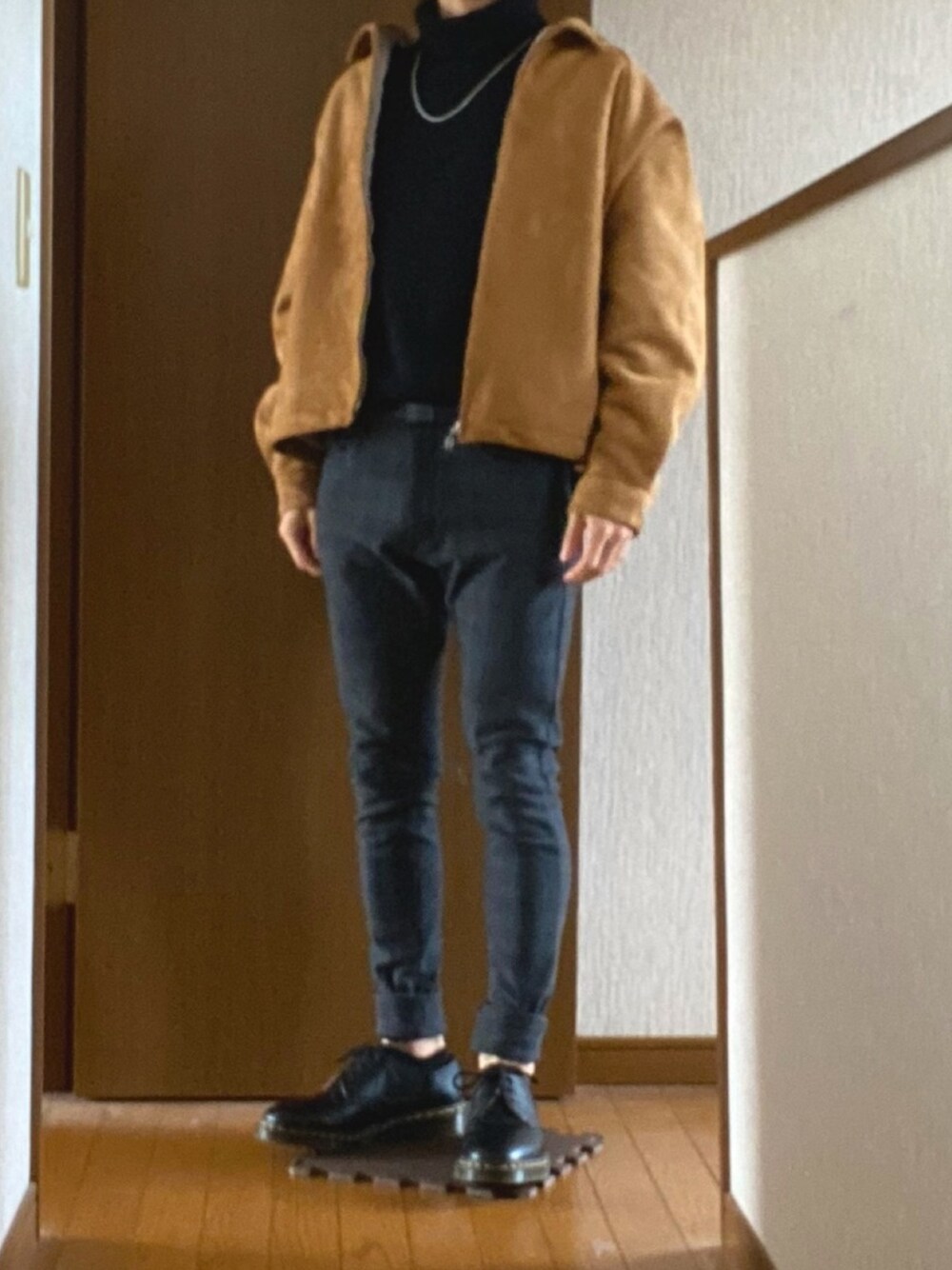 ブラックメインにキャメルのブルゾン タートルネックに裏起毛のパンツで暖かです☺️