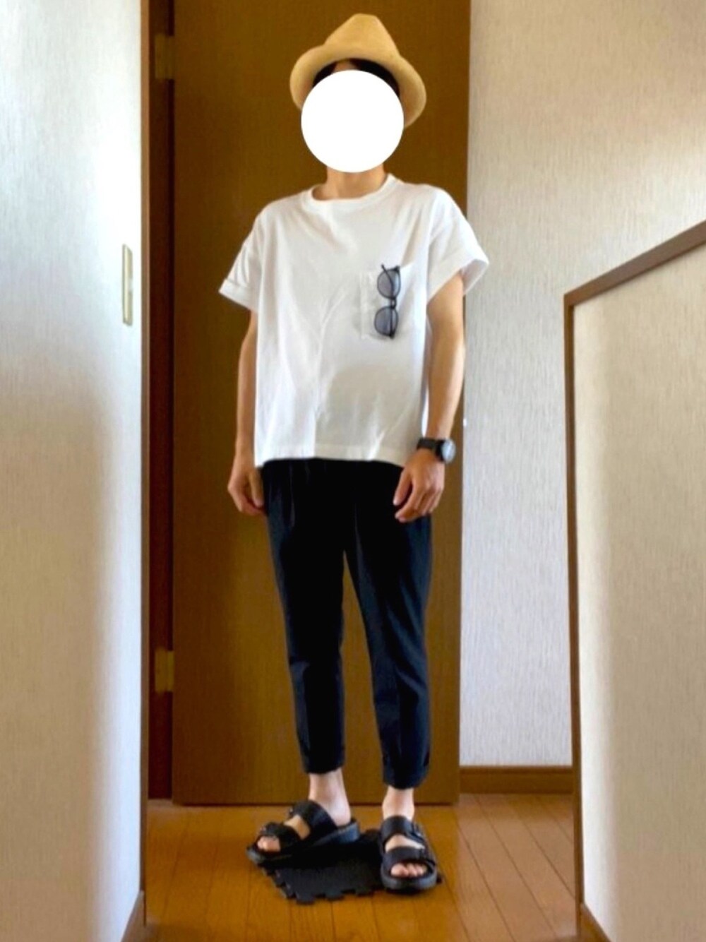 この前までスキニータイプばっかり履いてたけど最近はテーパードパンツがお気に入り笑 Tシャツはシルエットが好きで去年からずっと使ってます。胸ポケットにサングラスを掛けて麦わらも被ってみました。👒🕶