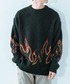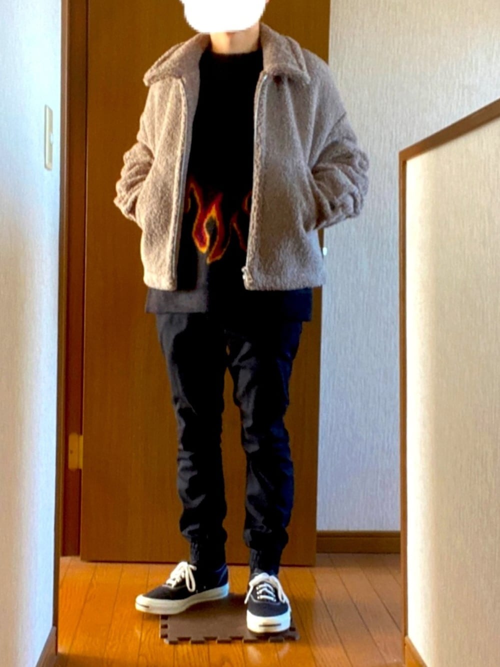 前回の色違いのニットで合わせました。 パンツとスニーカーも黒で縦のラインをつくってます。 アクセントの🔥