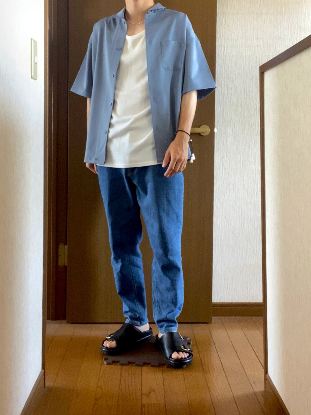 爽やか青コーデ🔵🏝 サックスブルーのシャツとデニムでワントーンに仕上げてます 首元は細身のパールネックレス、黒のレザーサンダルで足元を引き締めてます