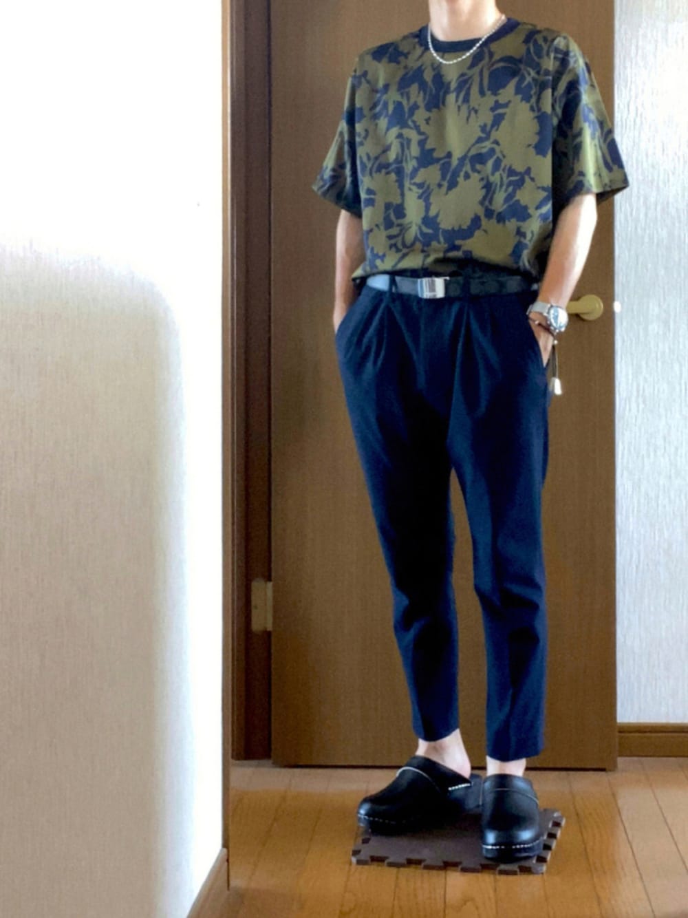ドレスライクなコーデを組みました ネイビーベースで、リーフ柄のトップスは光沢もあり上品になってます😎 厚底なサボサンダルでスタイルアップ👠🕺