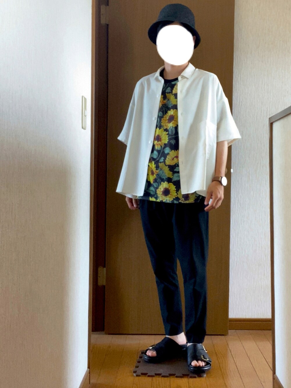 シャツコーデ パッと見普通ですがトップスでインパクトを🌻 途中、ひまわり畑がありますが縦に黒のラインをつくってます バケットハットは黒の麦わらです👒