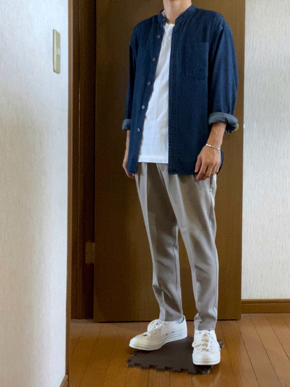 秋に着るため買っておいたデニムシャツの出番。 久しぶりのデニムシャツ👔 そしてまた久しぶりのバングル、何年かぶりです そしてそしてベージュのパンツの使い回しの良さに今頃気づきました😅