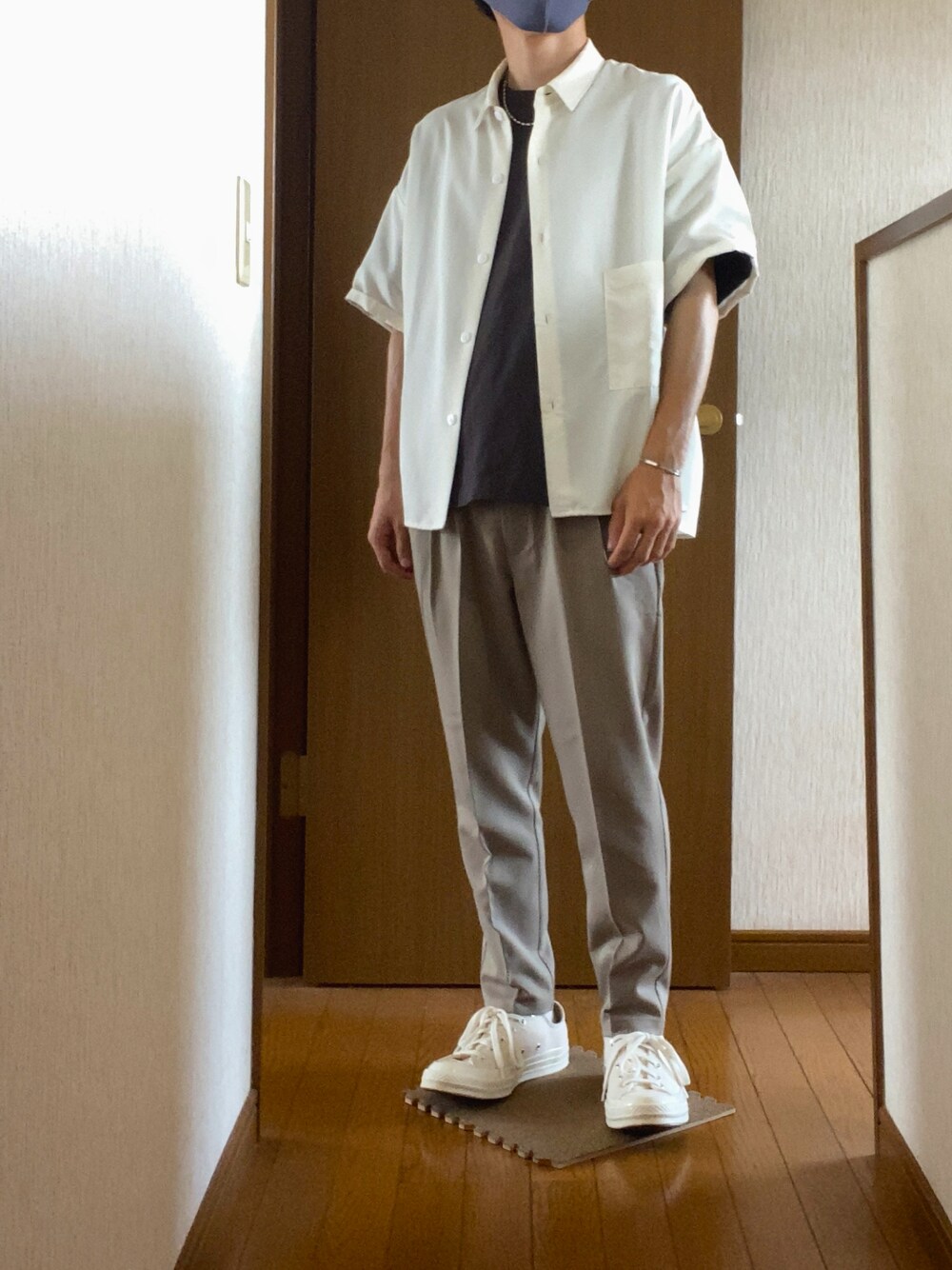 白とベージュのコーデ。 チャコールで色を締めてます。 黒じゃなくてチャコール、マスクもチャコールになってるのが個人的に👍