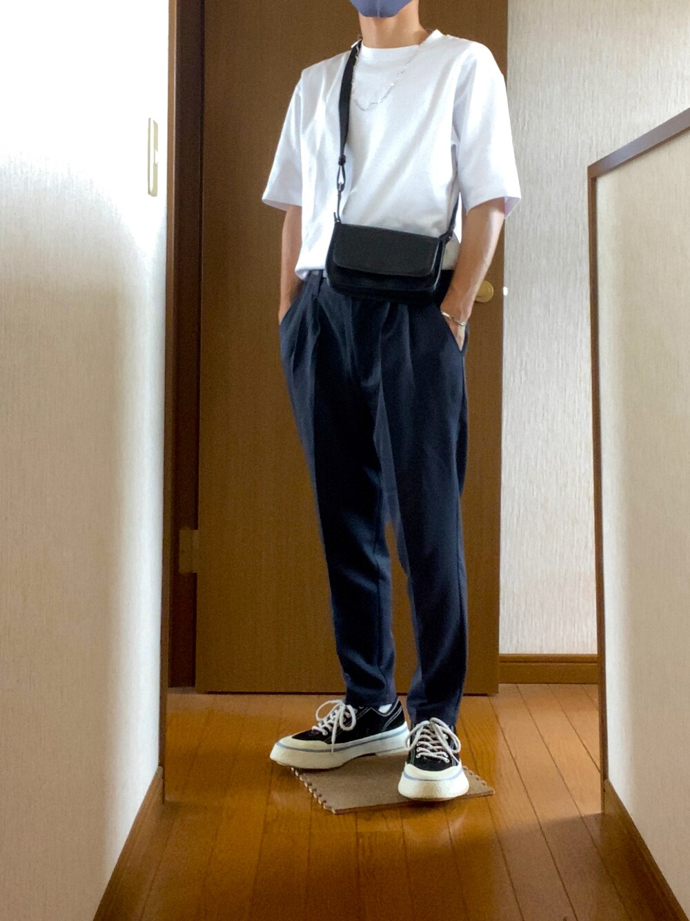 暑いので夏コーデ本格解禁です🏖 コーデがシンプルになりがちな夏は小物を追加 タックインとソールが厚めなスニーカーでスタイルアップ
