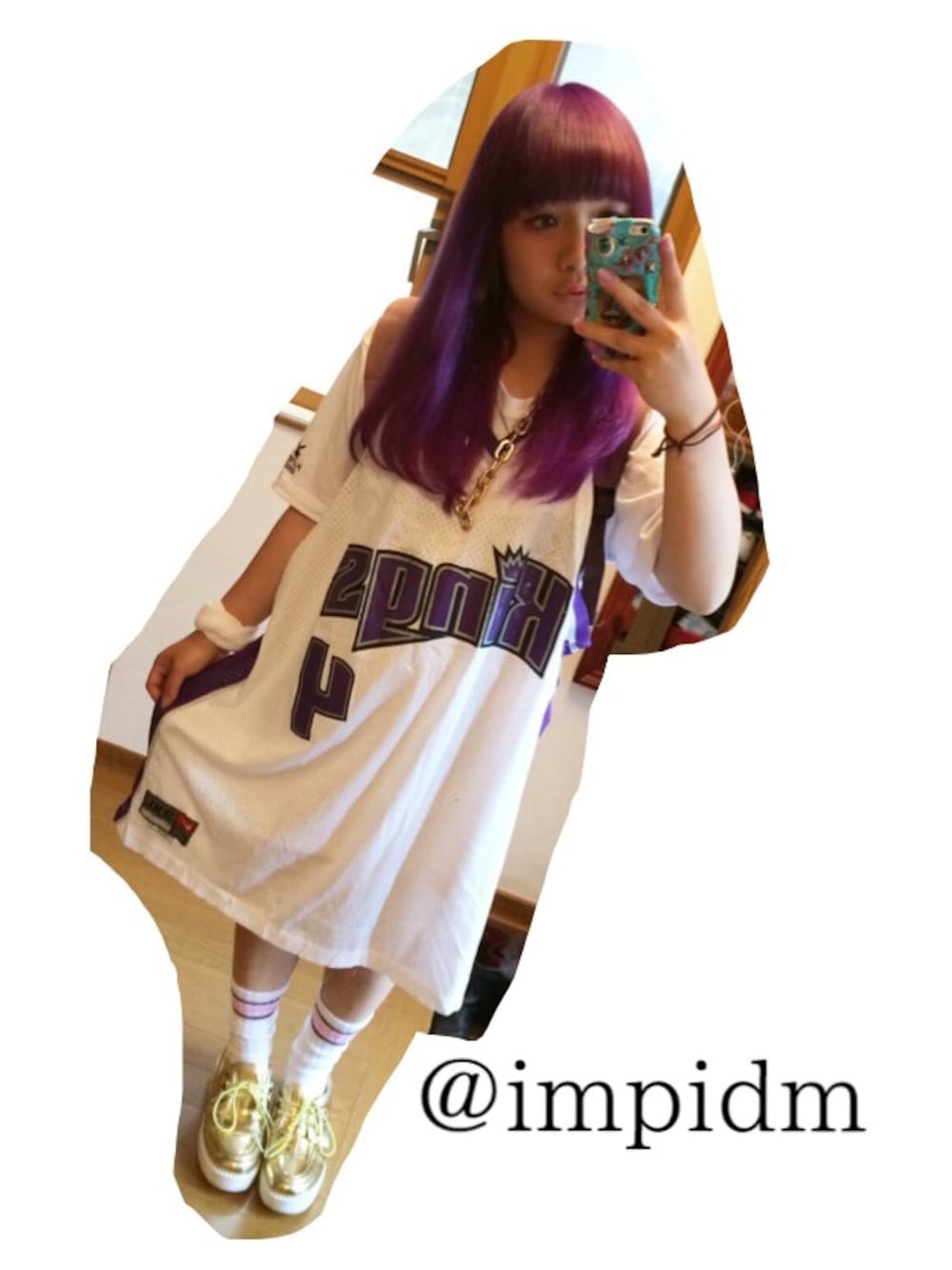 紫髪復活!!!!💜💜💜 るんるんで学校行ってくる〜♩ 可愛い可愛い紫可愛い大好き☜♡☞ 腕につけたヘアバンド NIKE バスケユニフォーム USED 中のTシャツ PLAY BOY ラインソックス 靴下屋 ラバソ Forever21