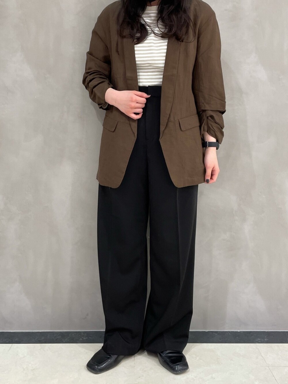 リネンのジャケットとても軽くて袖のクシャっと感がポイントです🍃 カジュアルなカットソーと合わせてジャケットですが綺麗めになりすぎないようにしました😊