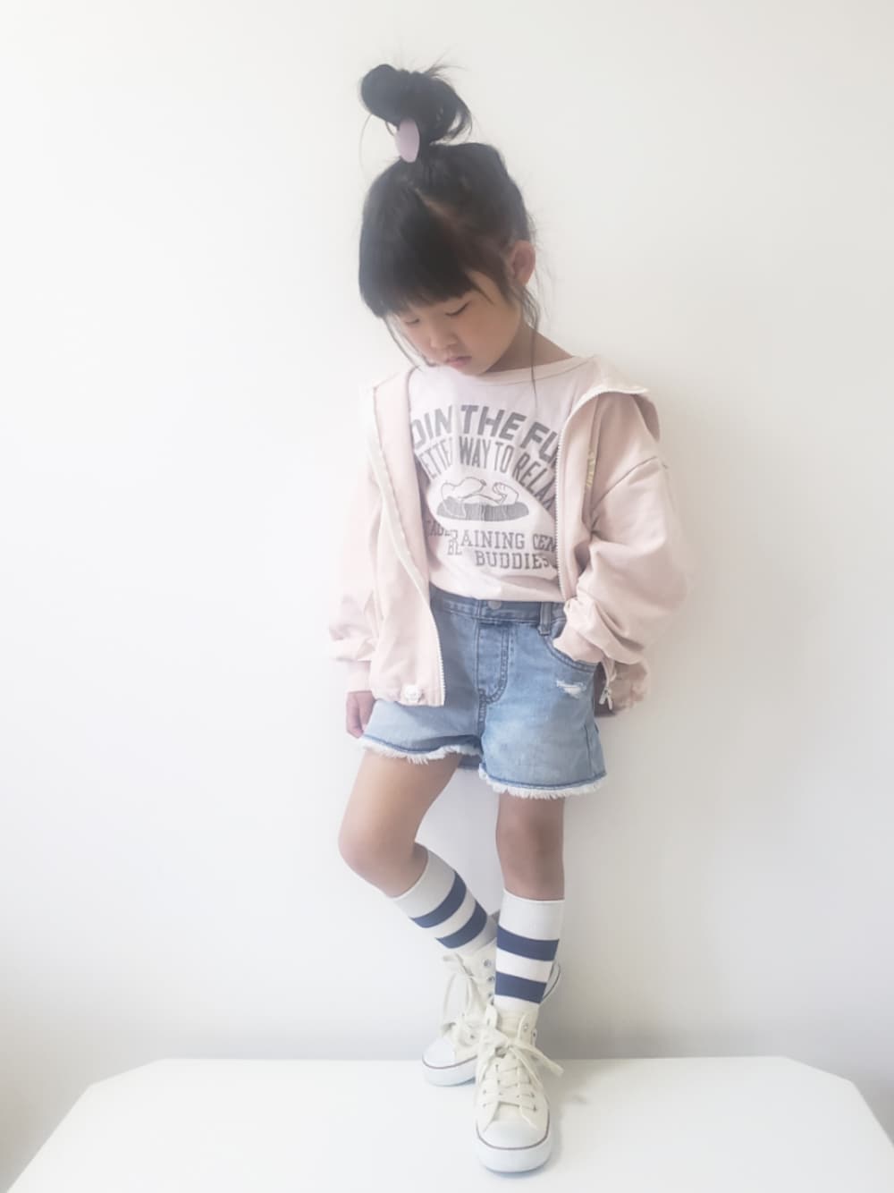 スポーツカジュアルコーデ♥️ フードジャケットにデニムショートパンツでスポーツカジュアル😊 淡い色味のコーデに思いきってぱきっとブルーのボーダーハイソ差し! 上の部分がラメ入りでかわいいのに白飛びしちゃいました😅 月曜日に体を動かしに行った公園で カラスノエンドウのお豆をたくさん収穫してきて 火曜日におままごとに使いました👩🍳 小さいお豆を房から出すのは根気のいる作業ですが 楽しそうに全部出して スチロールのごはんと混ぜて豆ごはん🍚 そして…… フライパンで炒めてバターソテーを作って お友達(ぬいぐるみ)にふるまっていました🤣