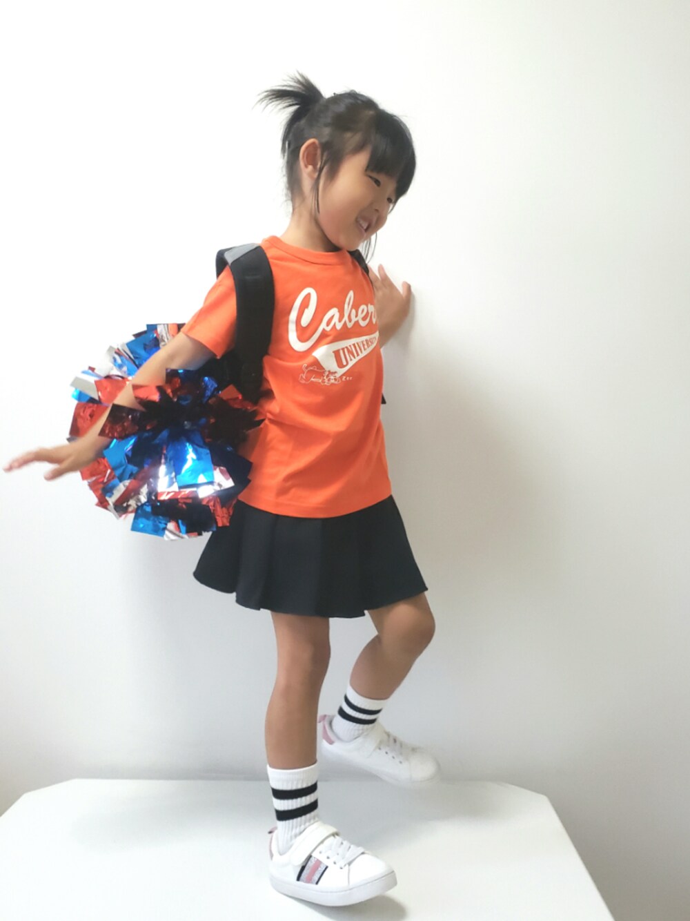 チアスクールコーデ♥️ また半袖に逆戻りでスミマセン💦 9月から念願のチアスクールに通い始めたんですが…… まだユニフォームがないので ユニフォームのカラーに合わせて オレンジのTシャツと黒のスカートを買いました😅 アメカジ風な柄がかわいいTシャツはセールで550円♥️ スカートは西松屋の売れ残りで500円♥️(笑) チア用に買ったH&Mのスニーカーは 軽くて履きやすくてお気に入りです😊 リュックにポンポンをぶら下げるのが憧れだったので (←私の🤣) 後ろ姿を見るたびに萌えちゃってます😍 レッスンは週1回1時間だけだけど 集中して頑張ってるみたいです👍
