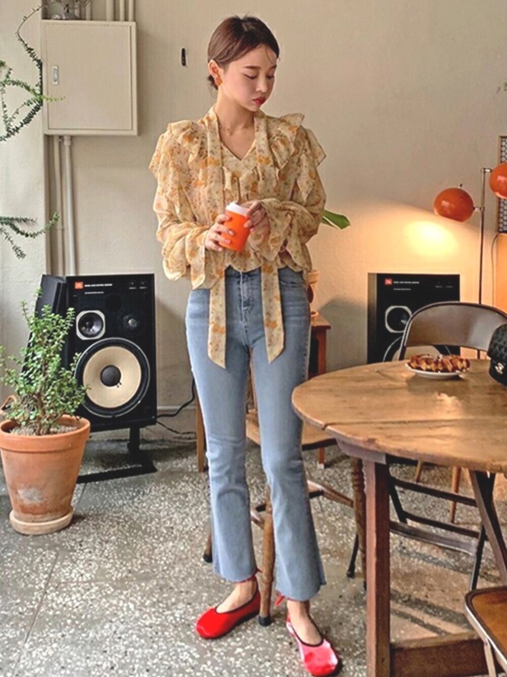 IMVELYのシャツ/ブラウス「イエローフラワーフリルブラウス」を使ったコーディネート