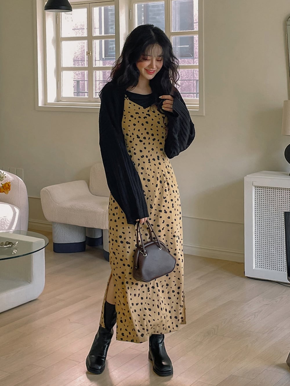 jihyun_imvelyのワンピース「[IMVELY] ラウンドレオパードビスチェロングワンピース」を使ったコーディネート