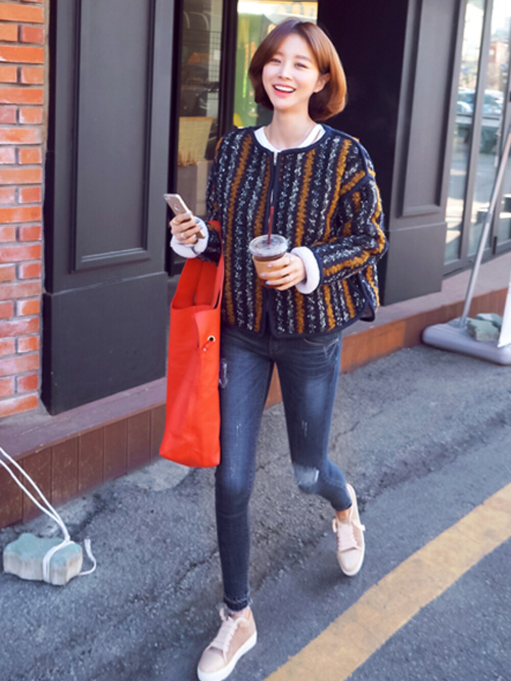 jihyun_imvelyのカバーオール「ラインストライプZIPニットジャケット」を使ったコーディネート