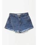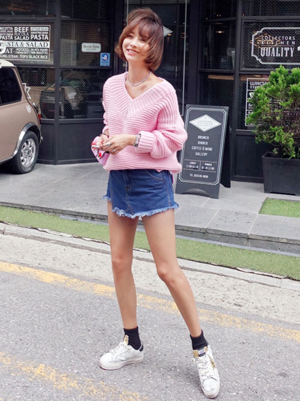 Vネックザックリ編みニット、デニムショートパンツスカート