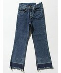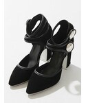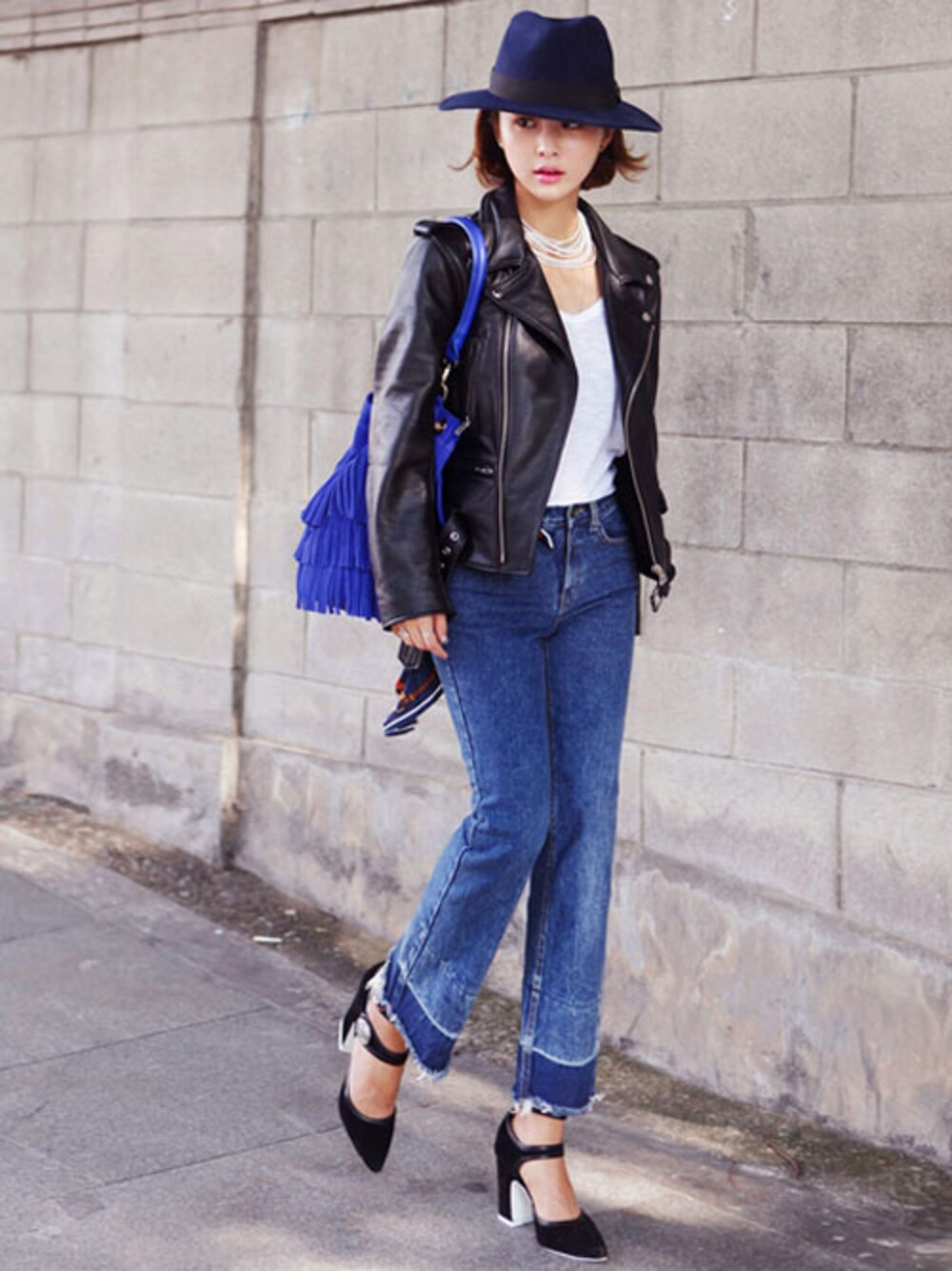 ライダースジャケット、ベーシックラウンドネックT、裾配色ブーツカットデニムパンツ、ダブルストラップパンプス