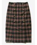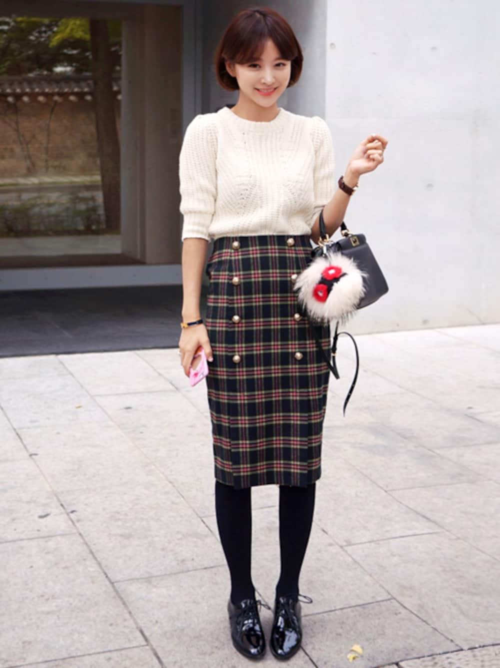 七分丈ニットトップス、タータンチェックミディスカート、エナメルブラックシューズ