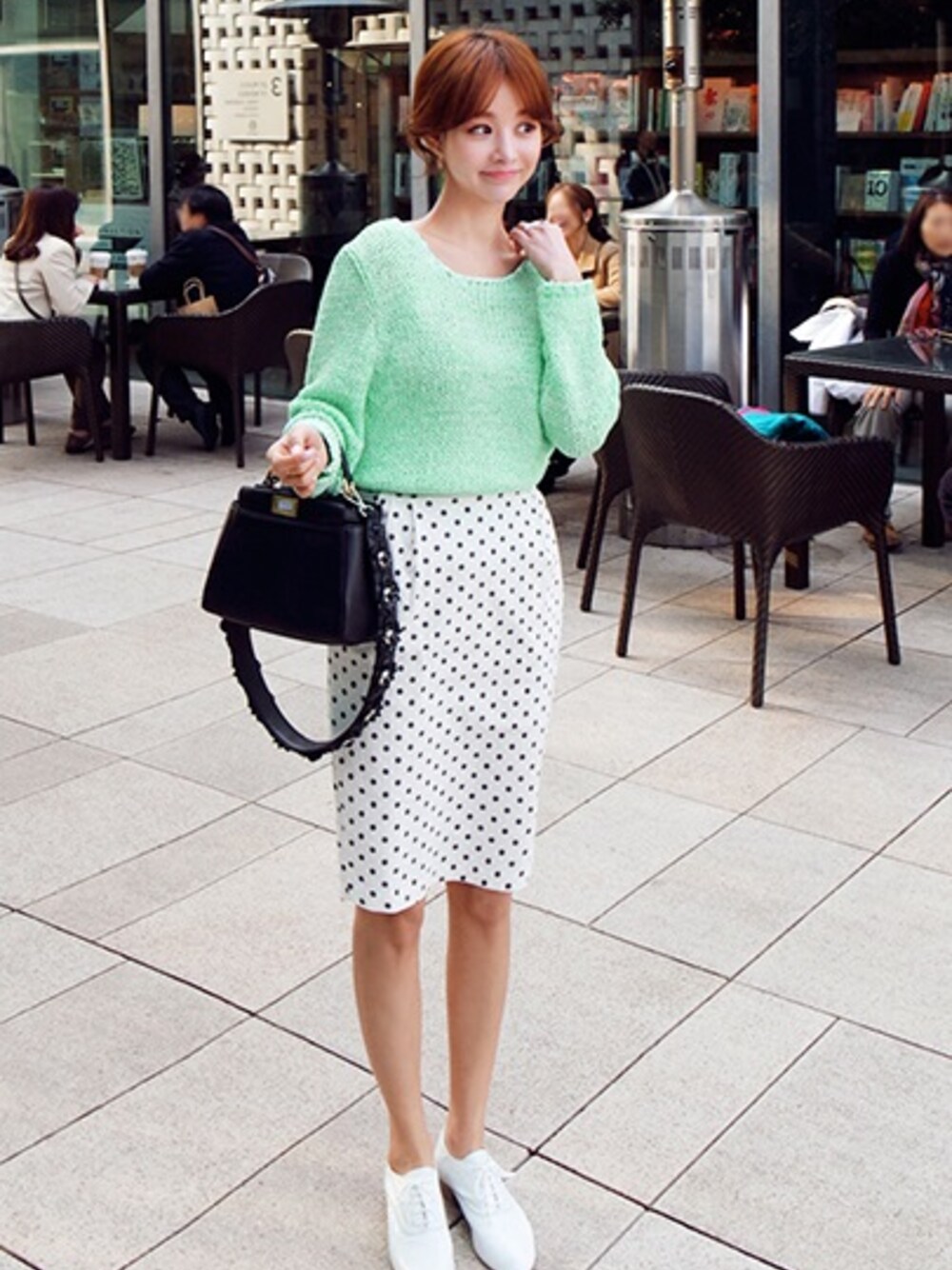 上品で可愛らしい 春のパステルカラーニットのご紹介をいたします♪ 春はやっぱりパステルカラー!! 爽やかで全体のコーデを華やかに してくれるので ミントカラーは明るい色なのに 合わせやすくコーデの幅が広がります。 思い切って可愛らしいドッドの スカートを合わせても 上品なコーデに仕上がりますよ☆ 足元は本革の白を合わせてあげることで 全体が明るくなりオシャレに見せてくれます。 この時期のパステルカラーコーデにおすすめです♪