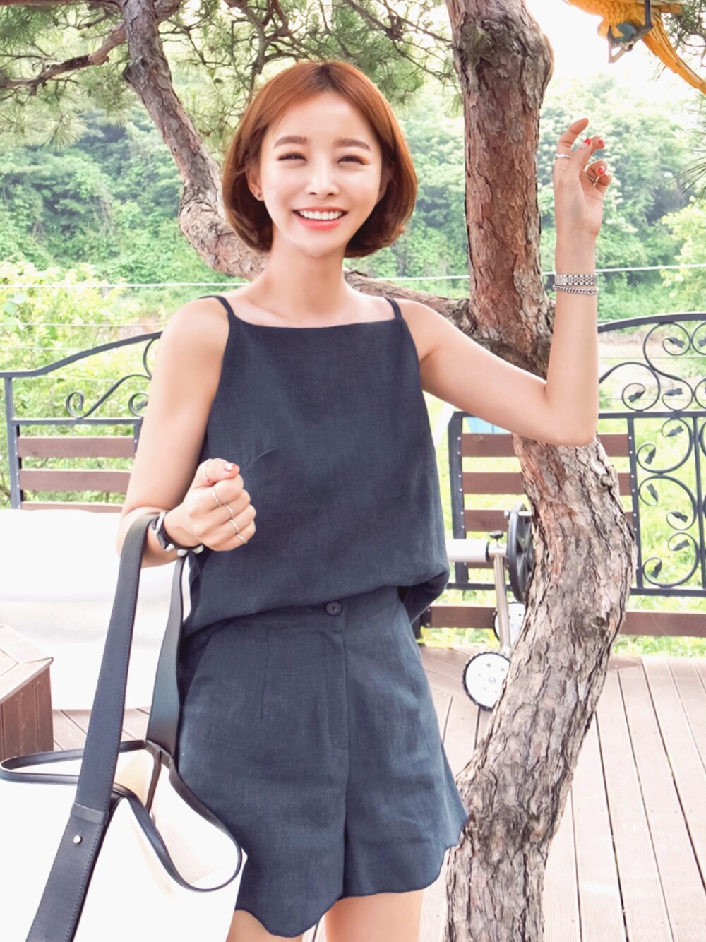 アウトドアに最適な スクエアネックキャミソールの リネンセットアップ★ 夏の涼しげコーデにおすすめの スクエアネックキャミソール×スカラップショートパンツ リネン素材で涼しげな着心地になります~ ネイビーの色合いが夏らしく 素敵な着こなしができます♪ ベーシックなのにセンスを感じさせるデザインで 夏のお出かけを楽しみましょう♡