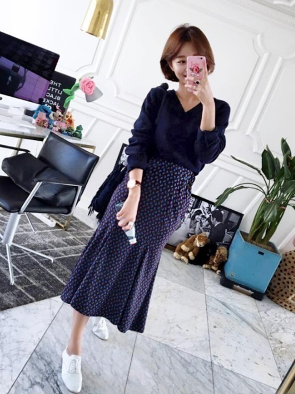 シルエットの女性らしさとドットパターンの大人っぽさがマッチした魅力的なスカートに雰囲気を高めたVネックニットでシンプルながら可愛いさもアップしたコーデ◎
