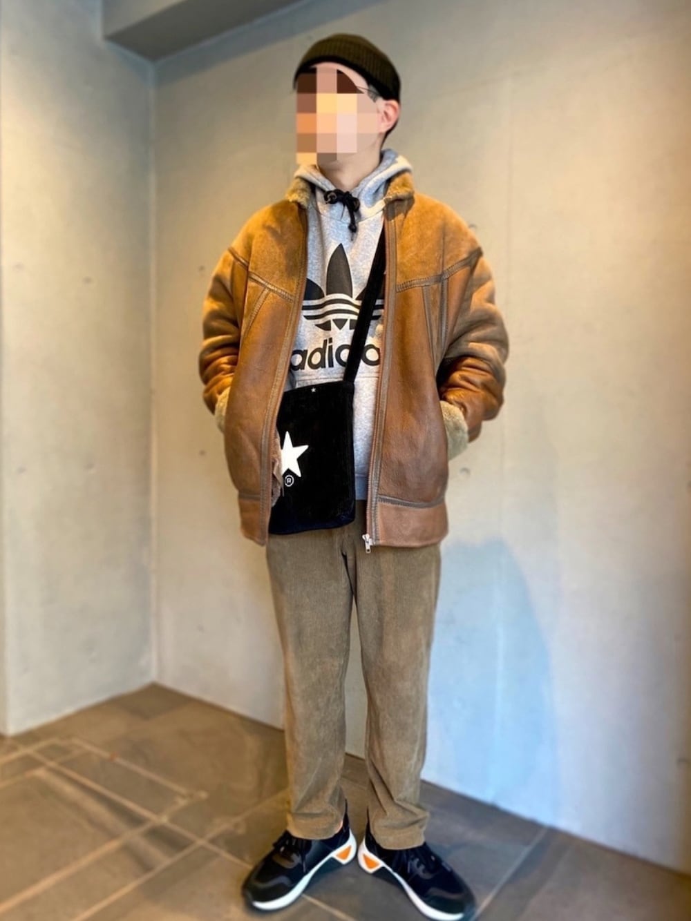 お気に入りのムートンレザージャケットでスタイリング! ブラック&ブラウン主体の挿し色にグレーとバランス良くコーデしてみました!