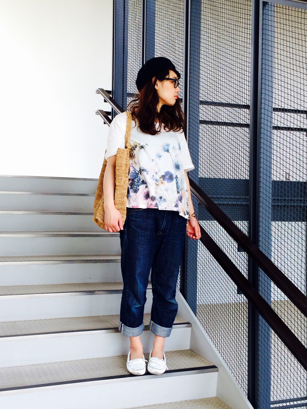 今日もとても暖かく過ごしやすいですね。 Tシャツに白モカシン、ざっくりカゴバッグで抜け感を出したラフな初夏の装いです。