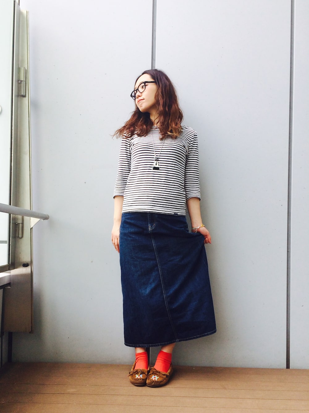 カラフルなビーズのマサイモックは履くだけで元気の出る一足です。 ボーダーとロングスカートのシンプルなコーディネートもマサイモックを履くだけで人とは少し違った雰囲気を出せます。