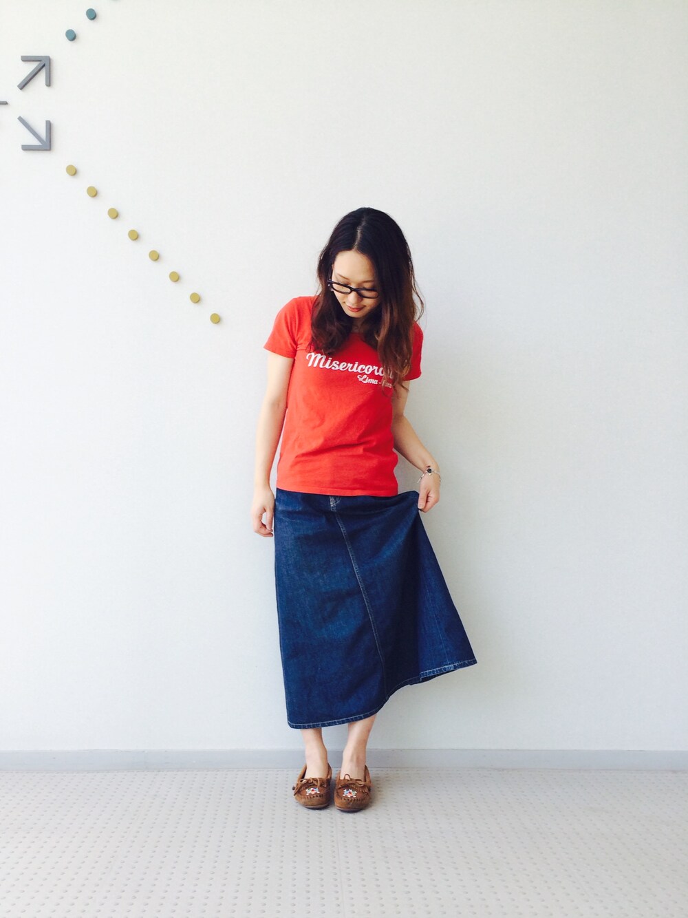 インパクトのある真っ赤なTシャツをシンプルにデニムスカートで。 足元はカラフルなビーズのマサイモックでシンプルな中にも個性を出しました。