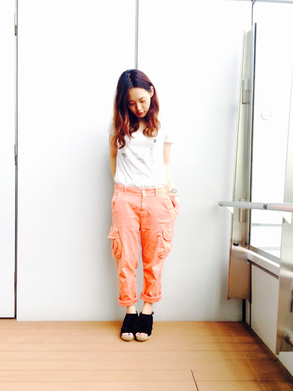 白のプリントTに、コーラルピンクのカーゴパンツでラフに。 だぼっとしたパンツにウェッジを合わせて少し女性らしさをプラスしました。