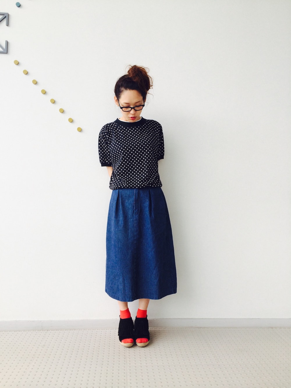 古着の半袖スウェットをインして少しレトロに。 ASHLEYにカラーソックスを合わせて厚底靴っぽく履きました。
