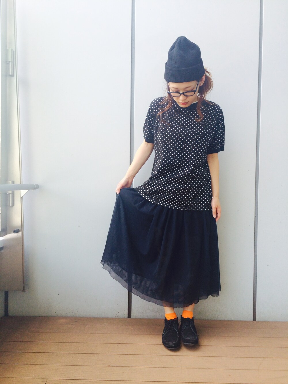 全身ブラックに靴下のオレンジをポイントにしました。 アンクルブーツは今の時期とても使いやすいです。