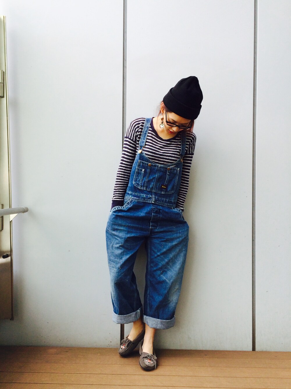 ボーダートップスにオーバーオールの定番コーディネート。 サンダーバードモカシンは甲が浅めなので足元をすっきり見せてくれます。