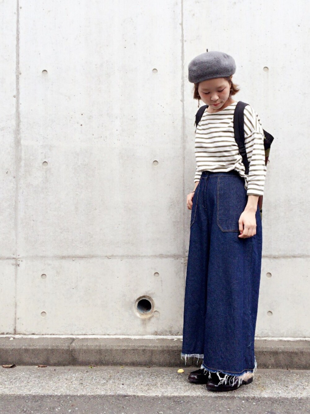 ▷ベレー帽 ▷バスクボーダー ▷usedのワイドデニム ▷ローファースリッポン ▷メロのリュック ▷NEW NAIL💅 ボーダー×迷彩リュック可愛いです◎