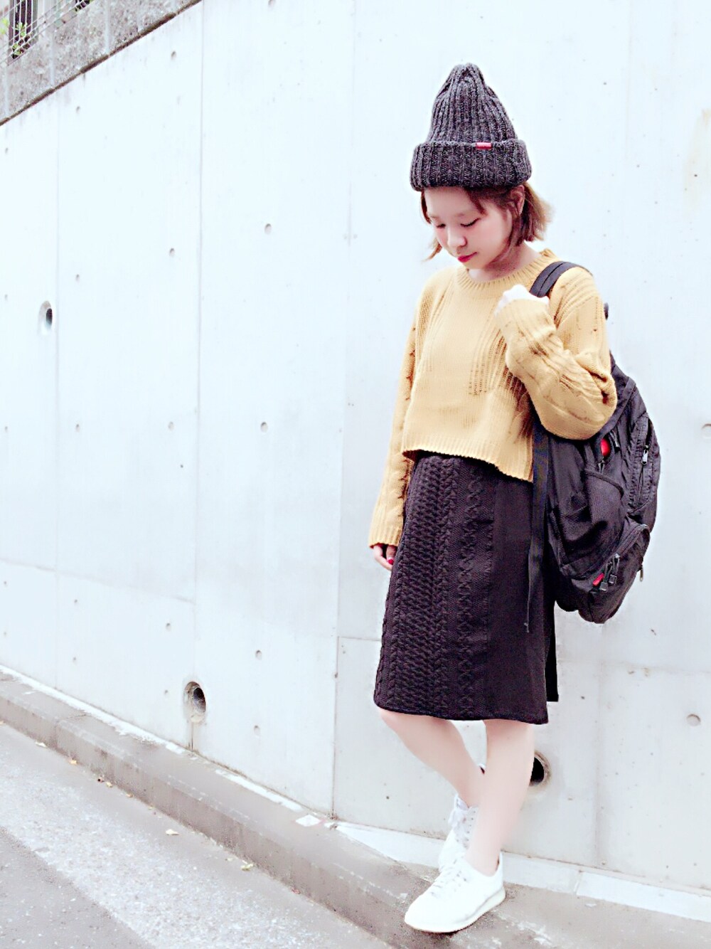 ▷ニット帽 ▷usedのショート丈ニット ▷ケーブル柄スウェットスカート ▷黒リュック ▷ジャガーの白スニーカー 休日コーデです。 約10匹いる実家の猫たちに会いに🐱