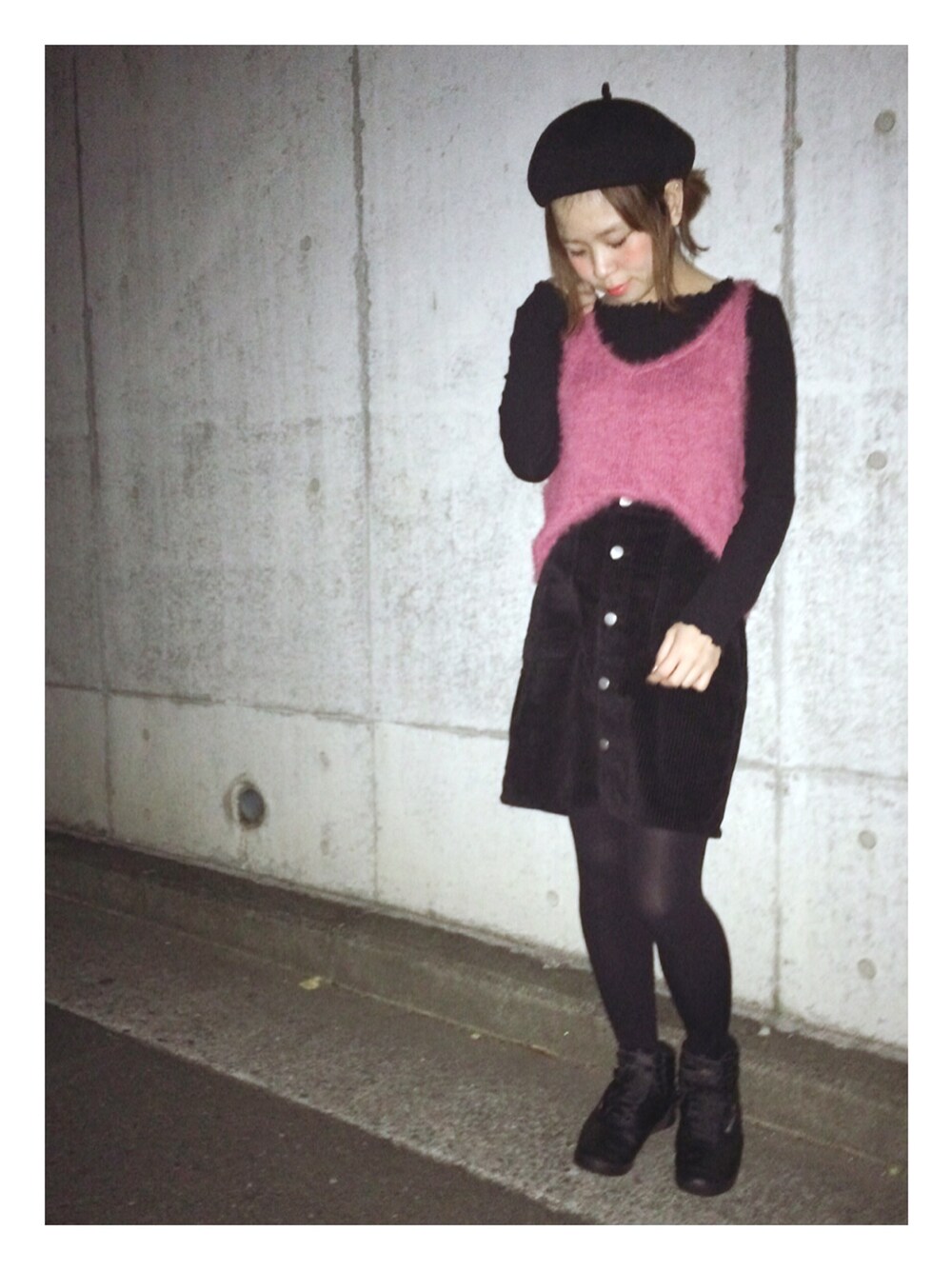 ▷黒ベレー帽 ▷フェザーニットビスチェ ▷太コーデュロイ台形スカート ▷黒スニーカー とにかく全身黒×ピンク、やりたかったStyle〜! ネイルもトレンドのピンクなんです♡ いつもいいね下さるみな様、 ありがとうございます♡