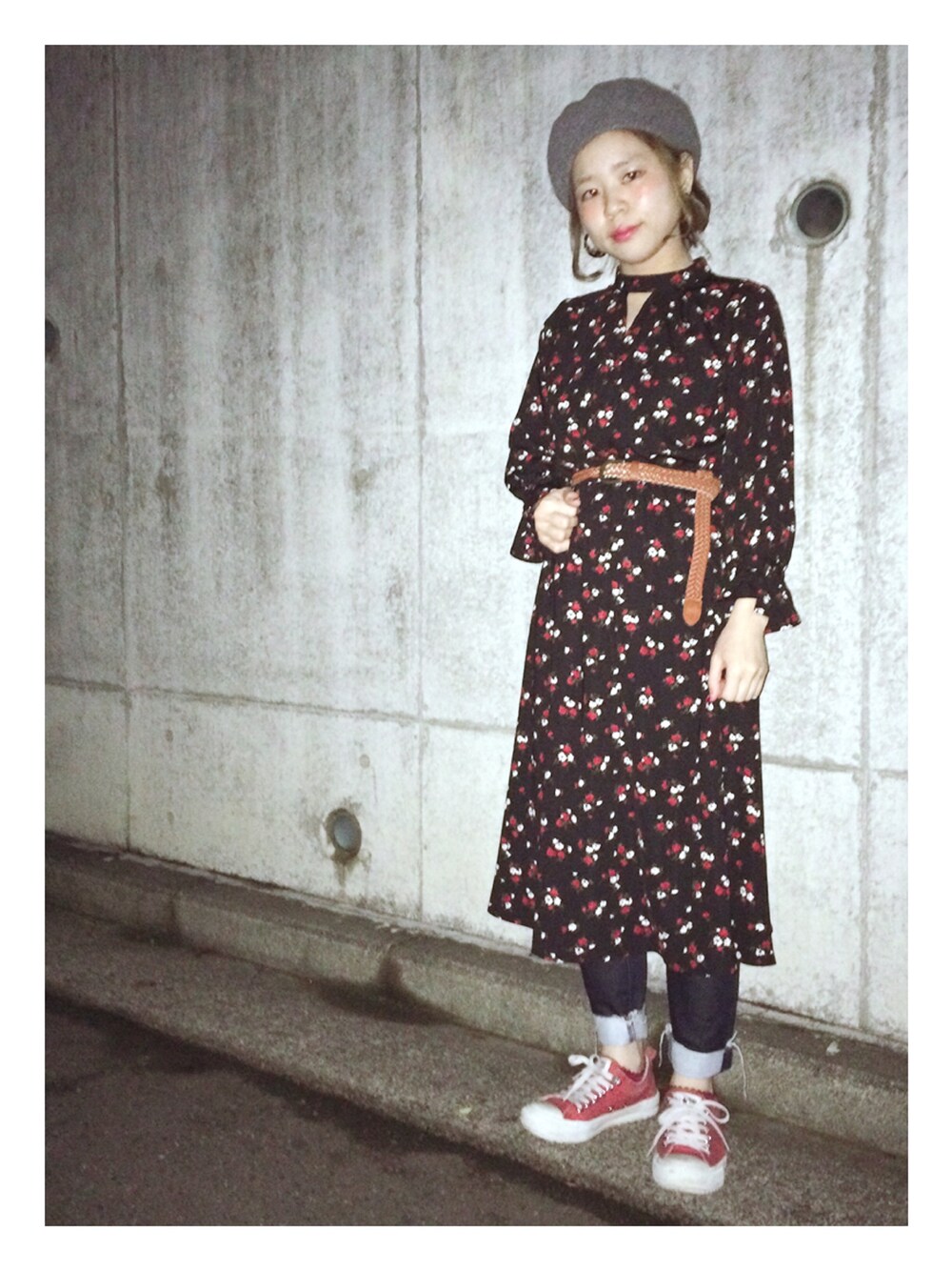 ▷グレーのベレー帽 ▷花柄ワンピース ▷スキニーデニム ▷赤コンバース ヴィンテージぽい花柄がキュートです。 髪もレトロなワンカールにしてから、まとめてます。 本日はリップも濃いめで💄✨