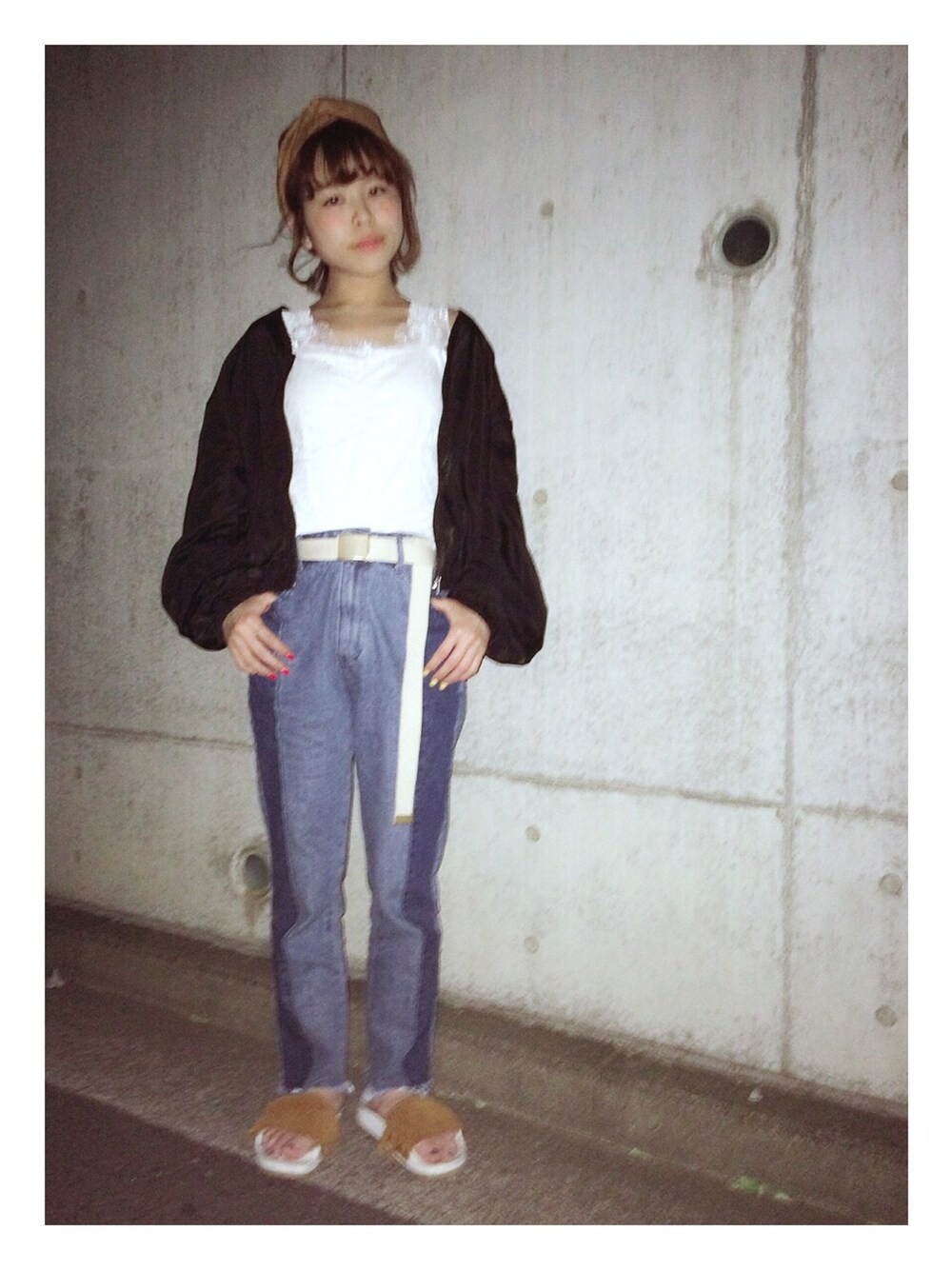 ▷レースキャミ ▷袖ボリュームブルゾン ▷配色デニム ▷ガチャベルト ▷スリッパサンダル デグーという賢いネズミを飼うか悩み中です🤔