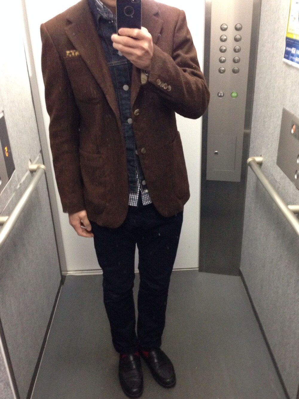 scyeのGジャンが中に入ってるジャケットにインディビのシャツ、ローファーからFALKEの赤いソックスチラ見せと胸のチーフもチラ見せ