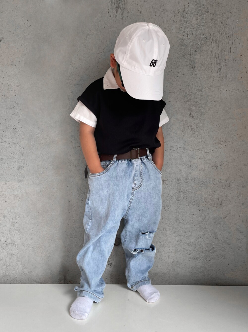 ブラック✖️デニム 黒のサマーベストに白いシャツを♡♡ キッズのベルト姿もめちゃめちゃ可愛い‼︎